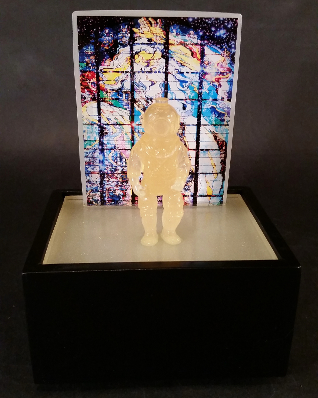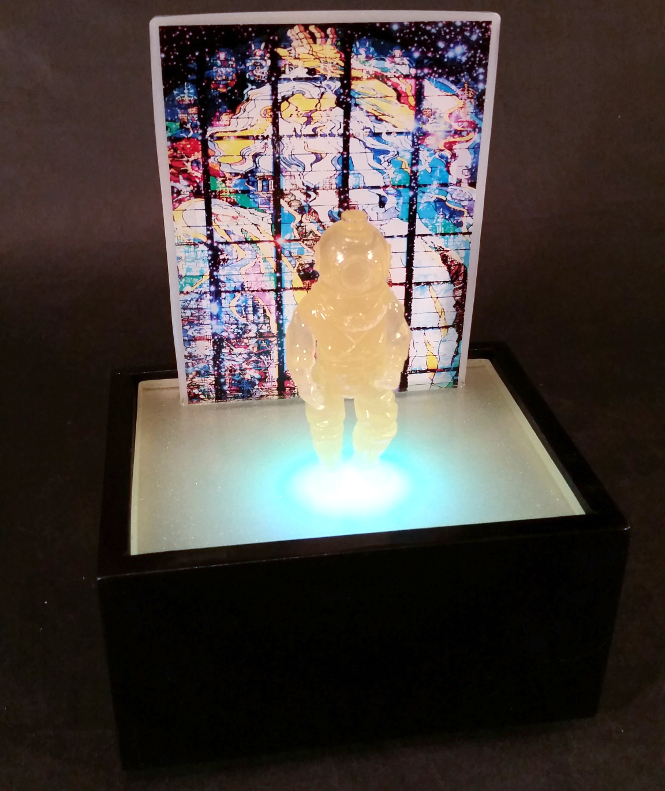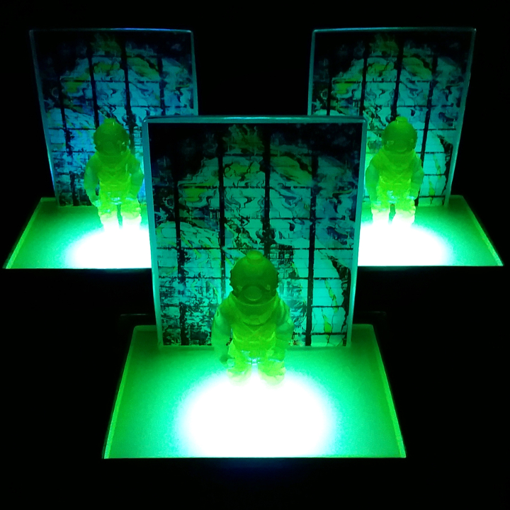 Edition of 3. Hand cast 3.75" scale glow-in-the-dark resin figure on base. Custom wood UV light box running on AA batteries.