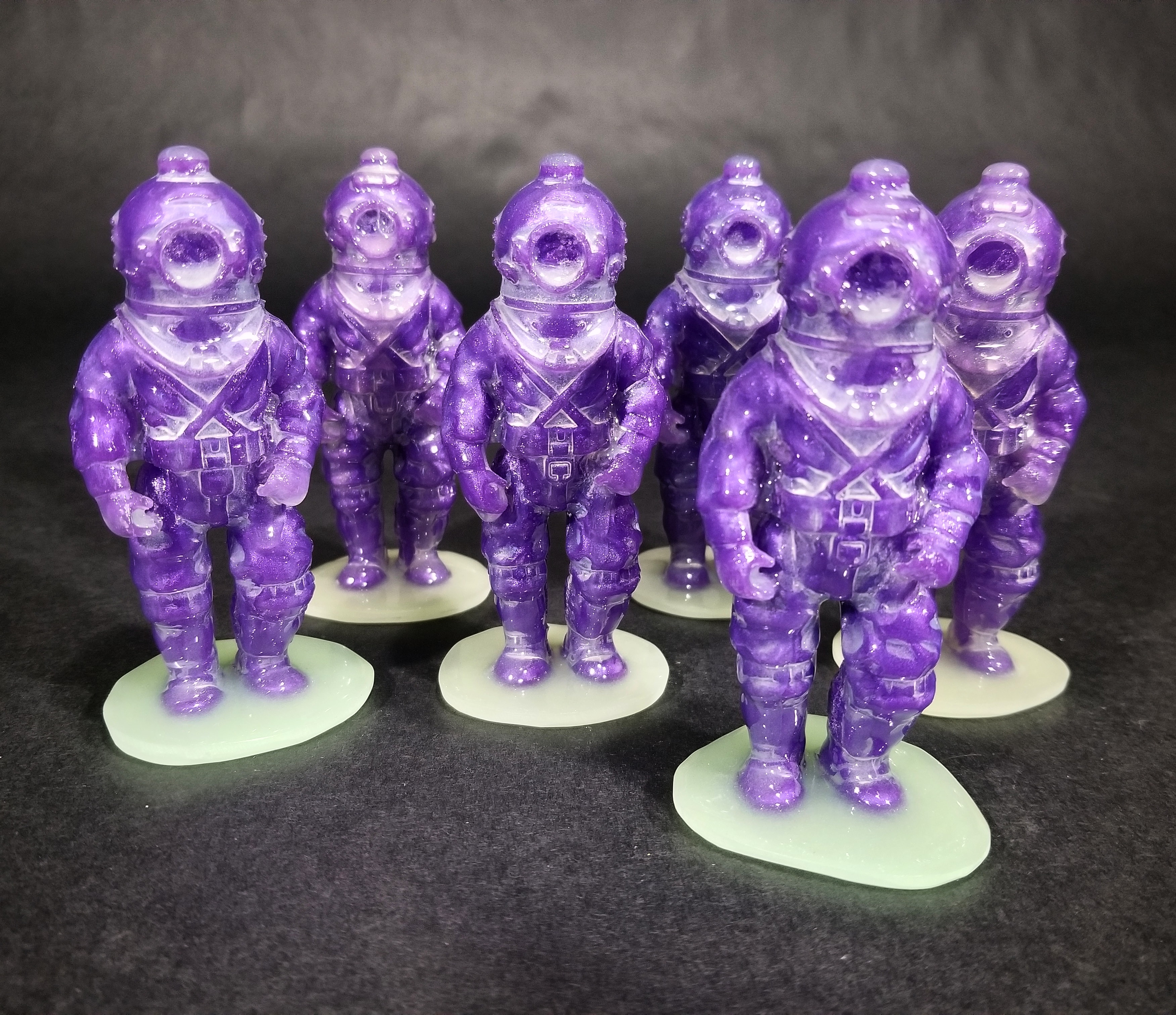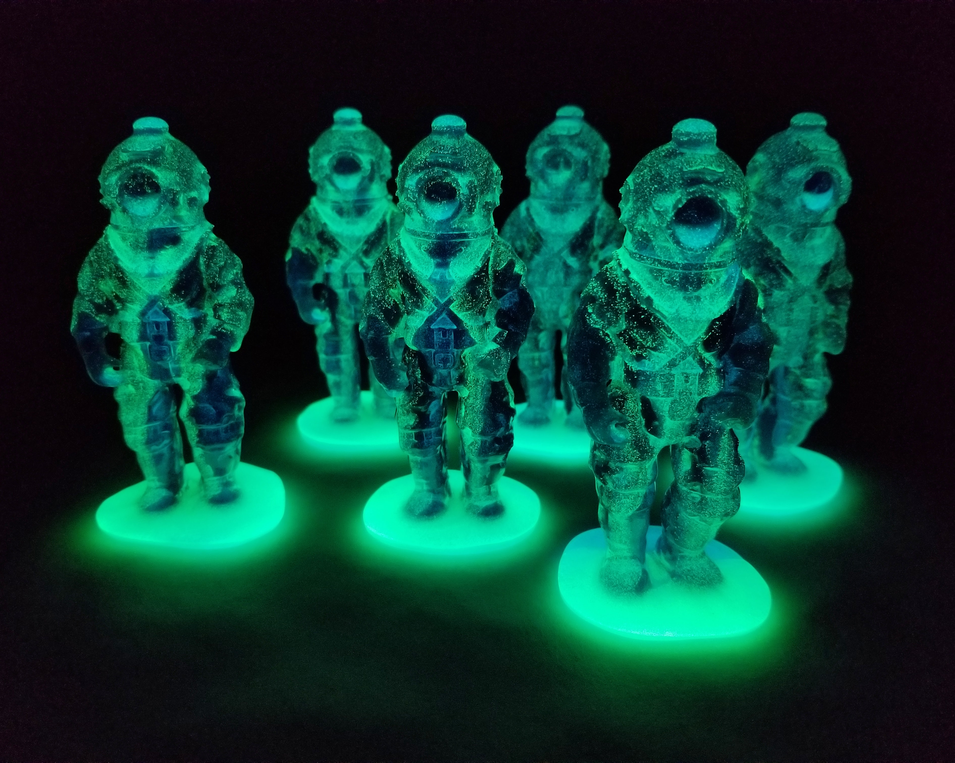 Edition of 6 hand cast resin figures measuring approximately 4"×2"×2". Signed, numbered and dated. Glow-in-the-Dark resin poured over top of the figures.