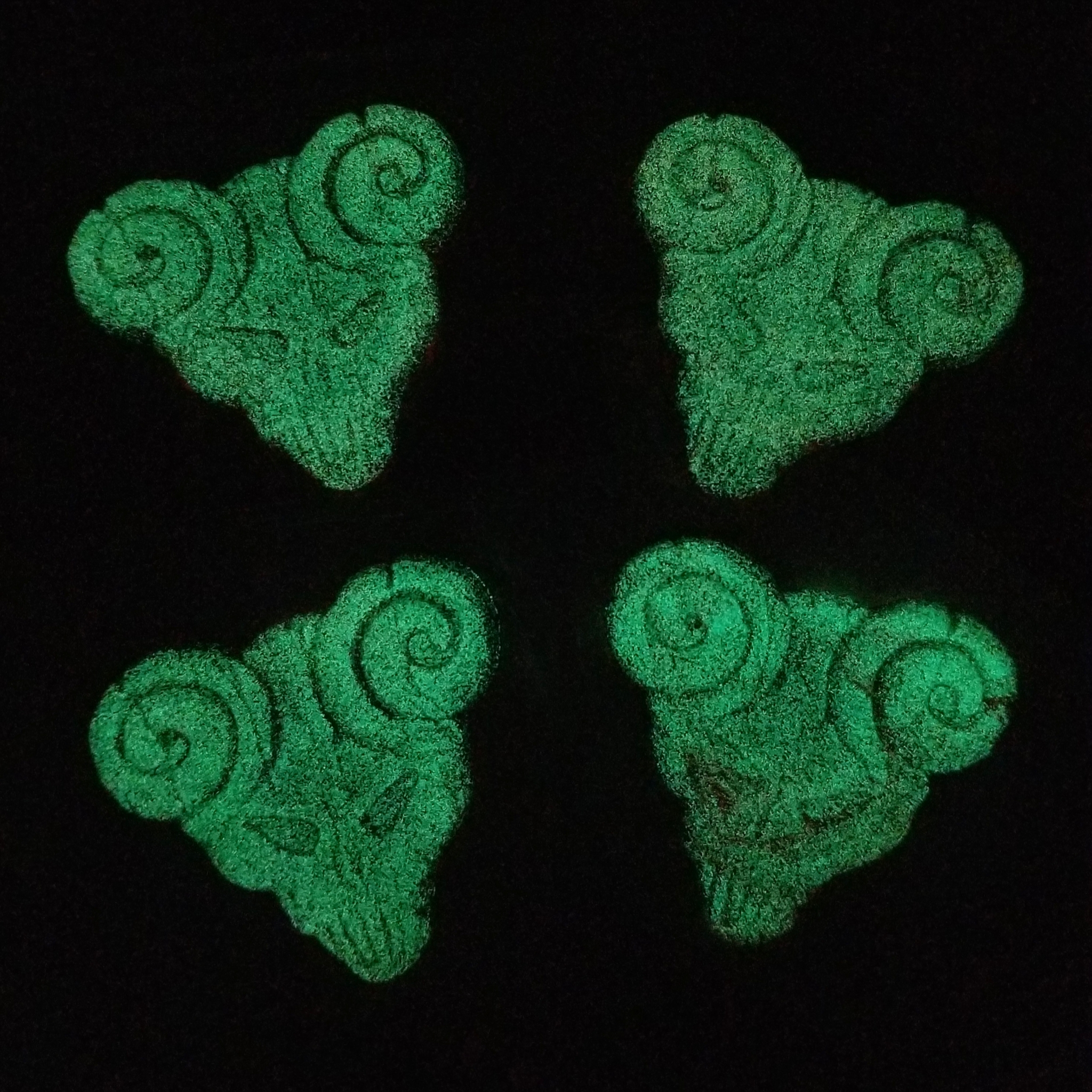 Edition of 4 hand cast resin pieces, approximately 2" diameter with Glow-in-the-dark capabilities. Bagged with header card, signed, numbered, and dated.