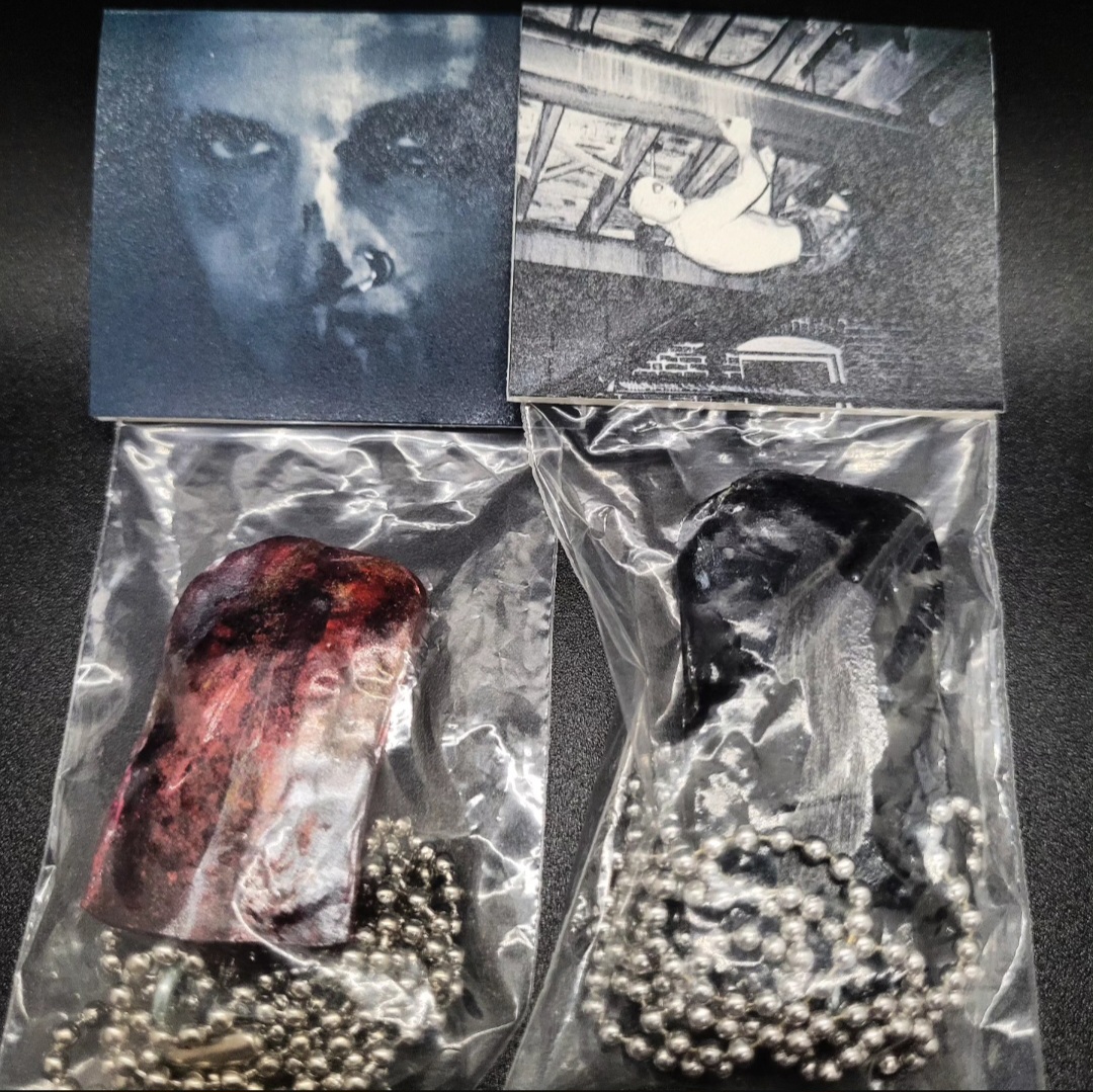 Hand cast resin pieces measuring approximately 2" with silver ball necklace. Bagged with header card.