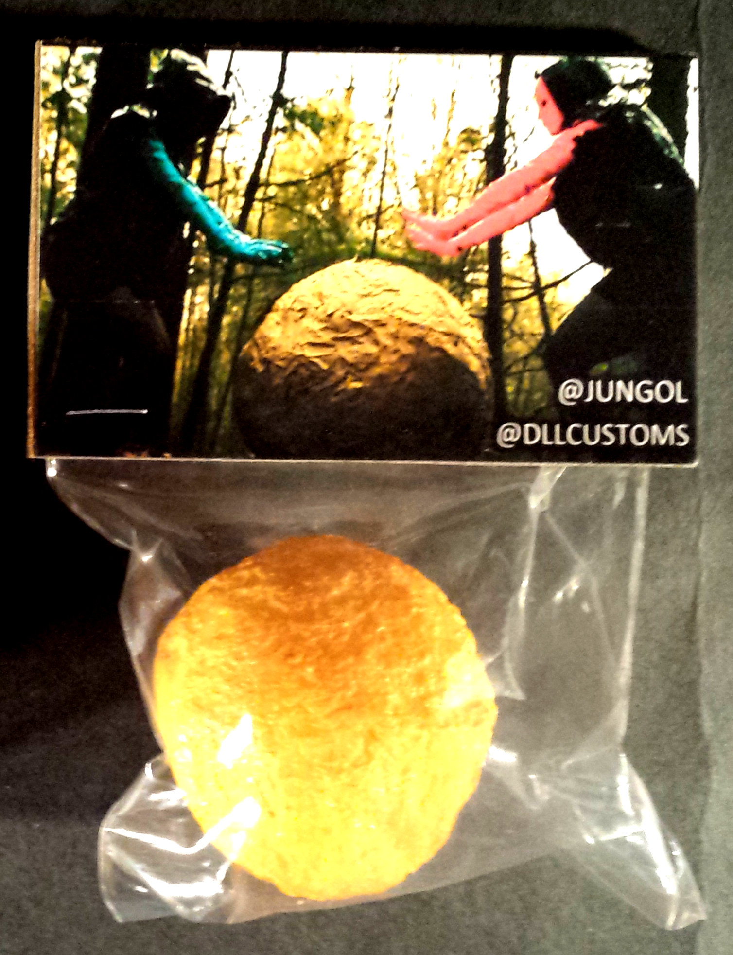 Bagged Edition of 2 for the 1st public film screening on 2/8/14. Glow-in-the-dark daytime-visible orange. Acrylic/enamel paint w/clear lacquer finish. Spray-laminated Cannon FINE Inkjet Prints mounted on 4"x2.5" backer board header card. Signed and numbered (not shown).
