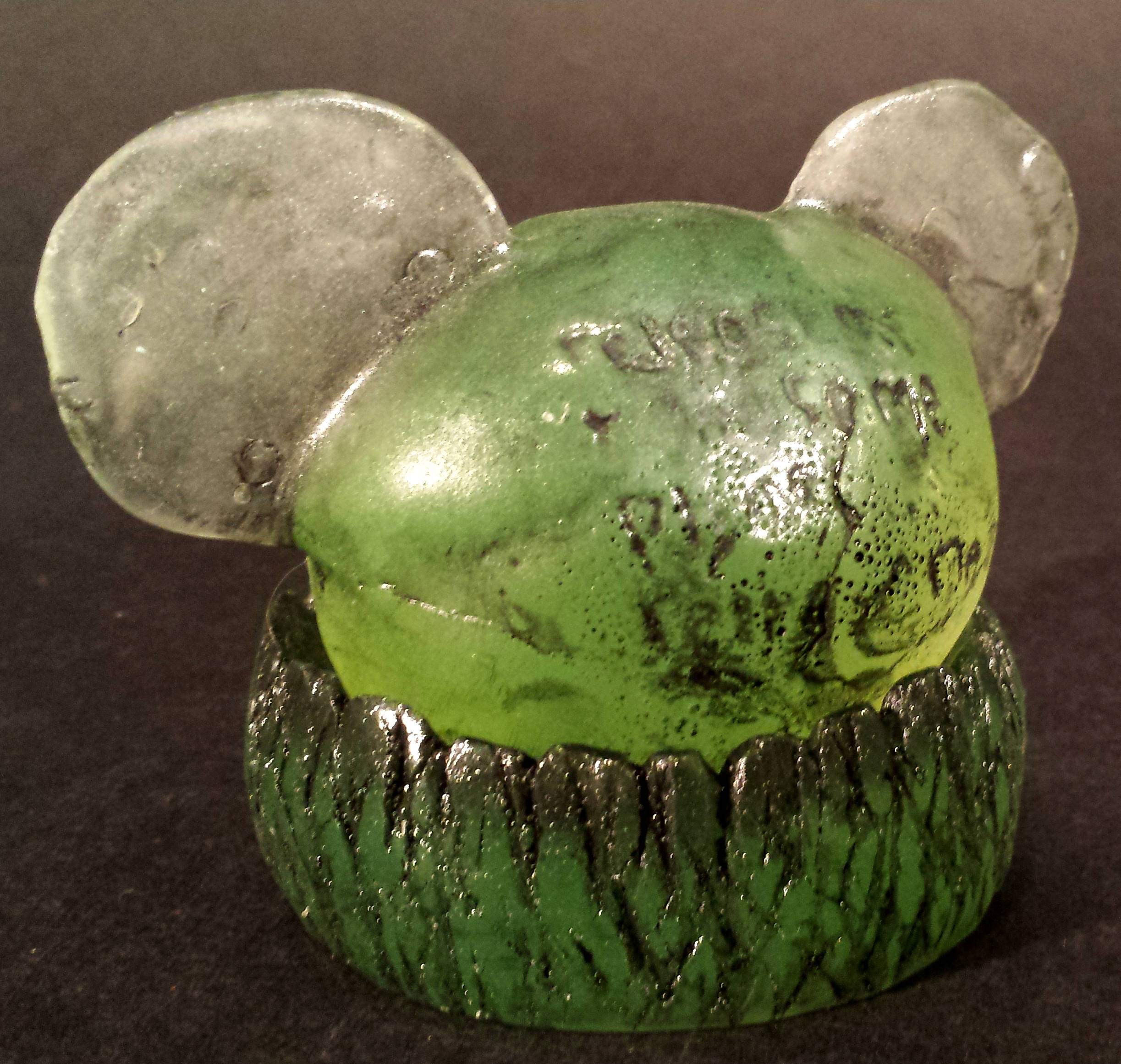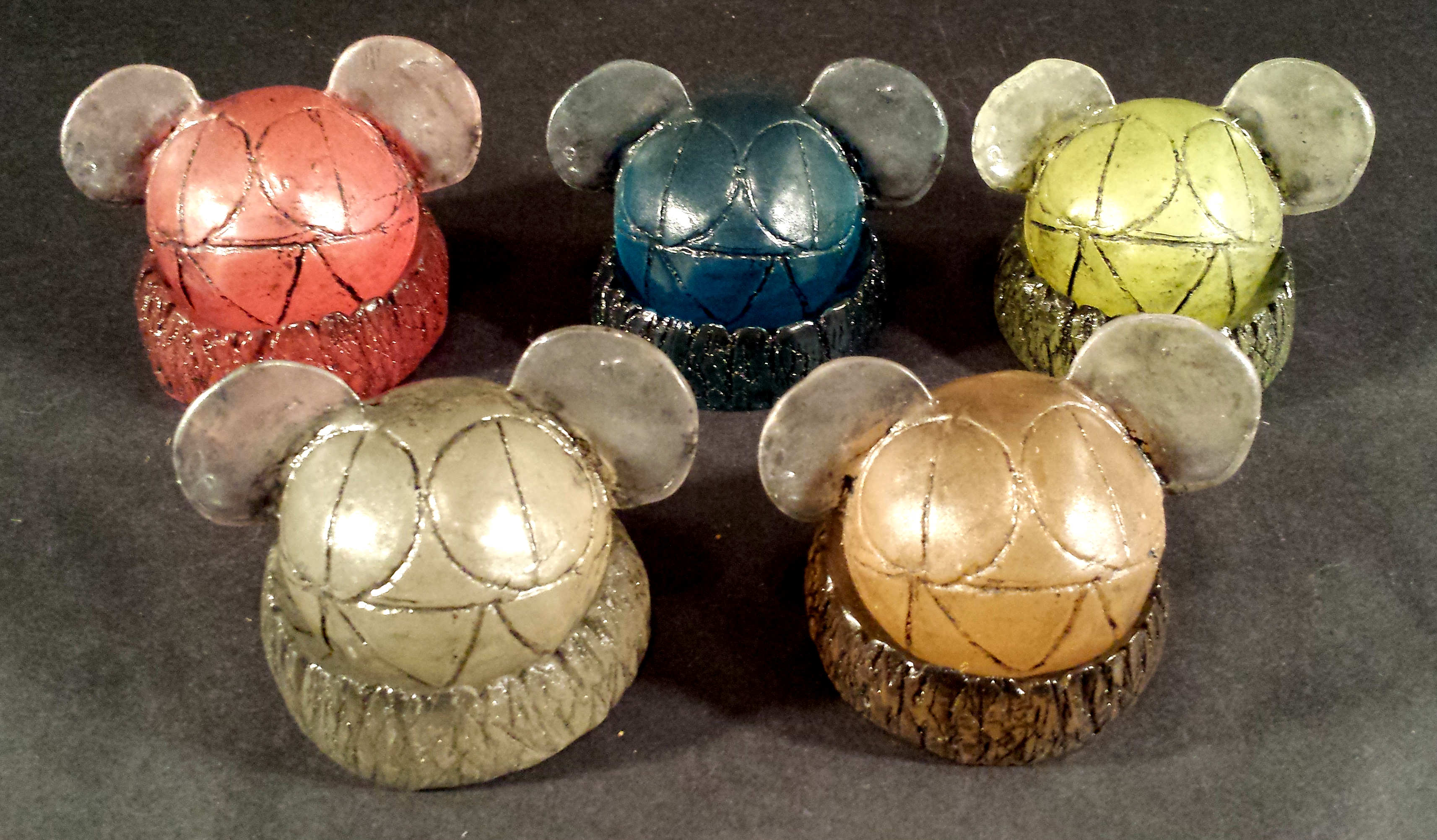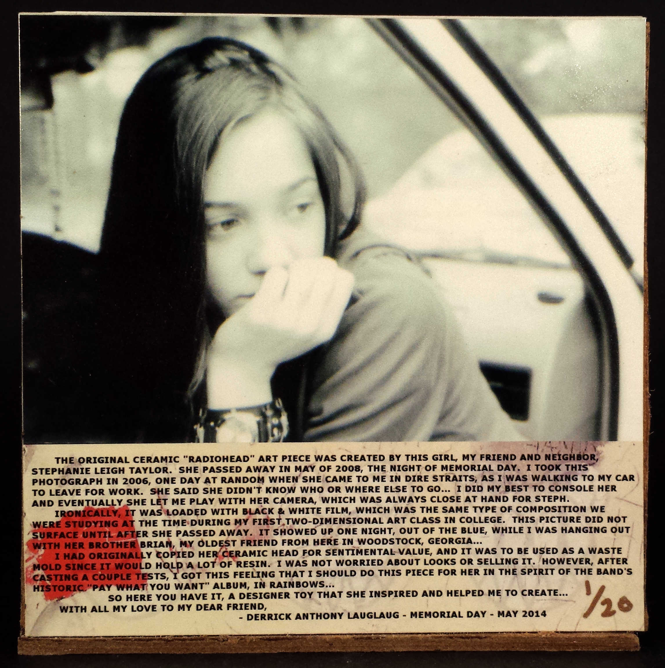 EDITION OF 20 PIECES (10-GREEN & 2 OF EACH VARIANT COLOR) CONSISTING OF 4"x2.5"x2.5" RADIOHEADS ON 1"x3" DIAMETER ROUND BASES WITH 4.5"x4.5"x6.5" DISPLAY STAND. GLOW IN THE DARK CAPABILITIES. BLACK ACRYLIC PAINT. HP OFFICEJET 6700 PREMIUM INKJET PRINTS. CLEAR LACQUER FINISH. SIGNED (NOT SHOWN) AND NUMBERED